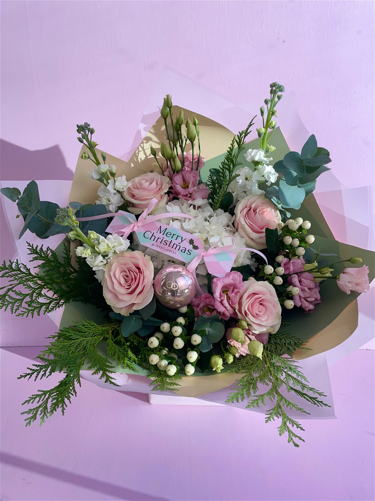 This Christmas we have a mix of festive flowers & foliage chosen by our in-house florist from our daily fresh stock in the colous of Pale Pink,White & Green.
