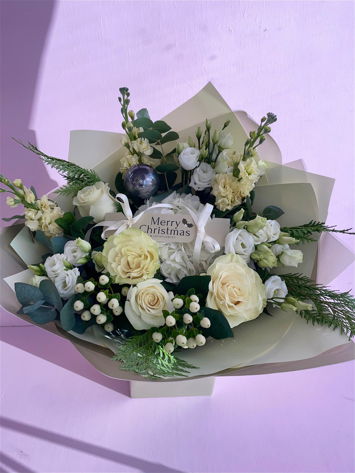 This Christmas we have a mix of festive flowers & foliage chosen by our in-house florist from our daily fresh stock in the colous of whites & metallics.