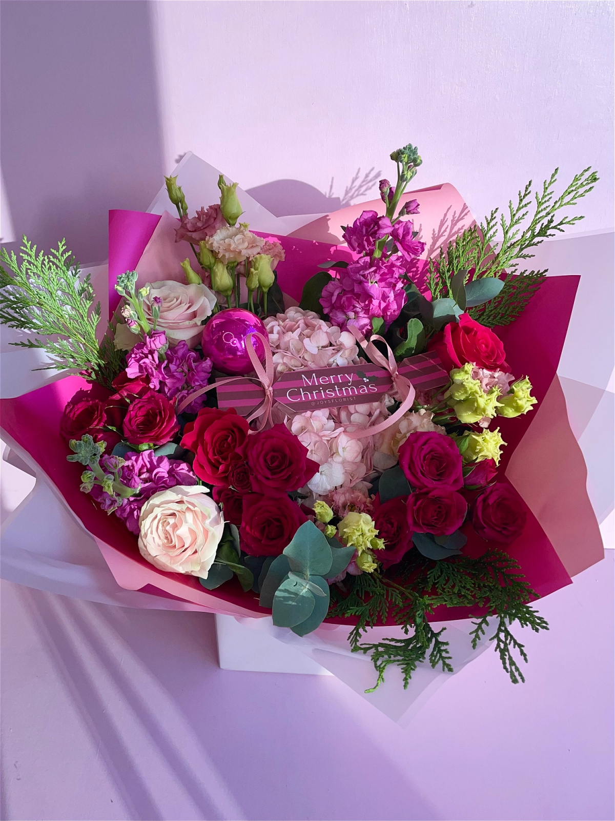 This Christmas we have a mix of festive flowers & foliage chosen by our in-house florist from our daily fresh stock in the colous of Pale Pink, Hot Pink & Red.